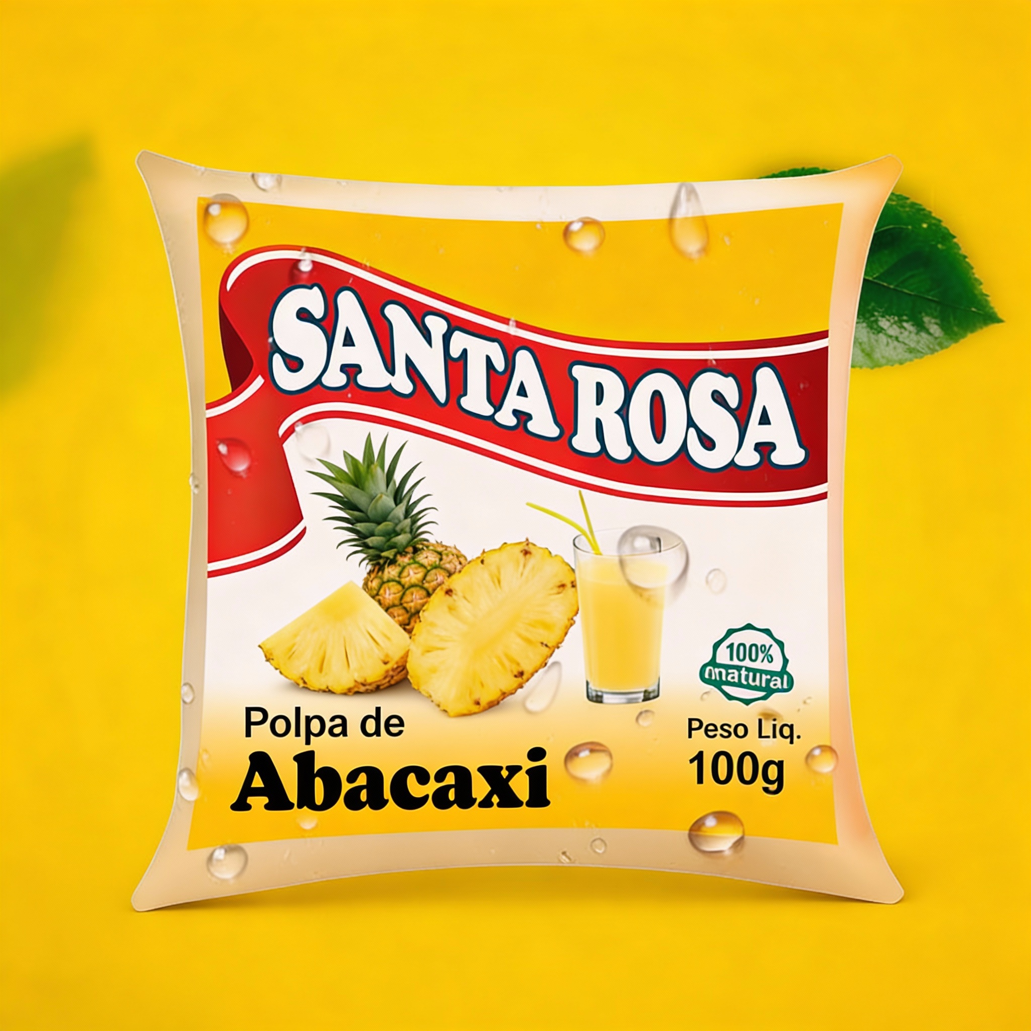 Polpa de abacaxi com sabor equilibrado entre doce e ácido, ideal para sucos e receitas. Pacote com 20 unidades de 100g, valor unitário de R$ 0,85.